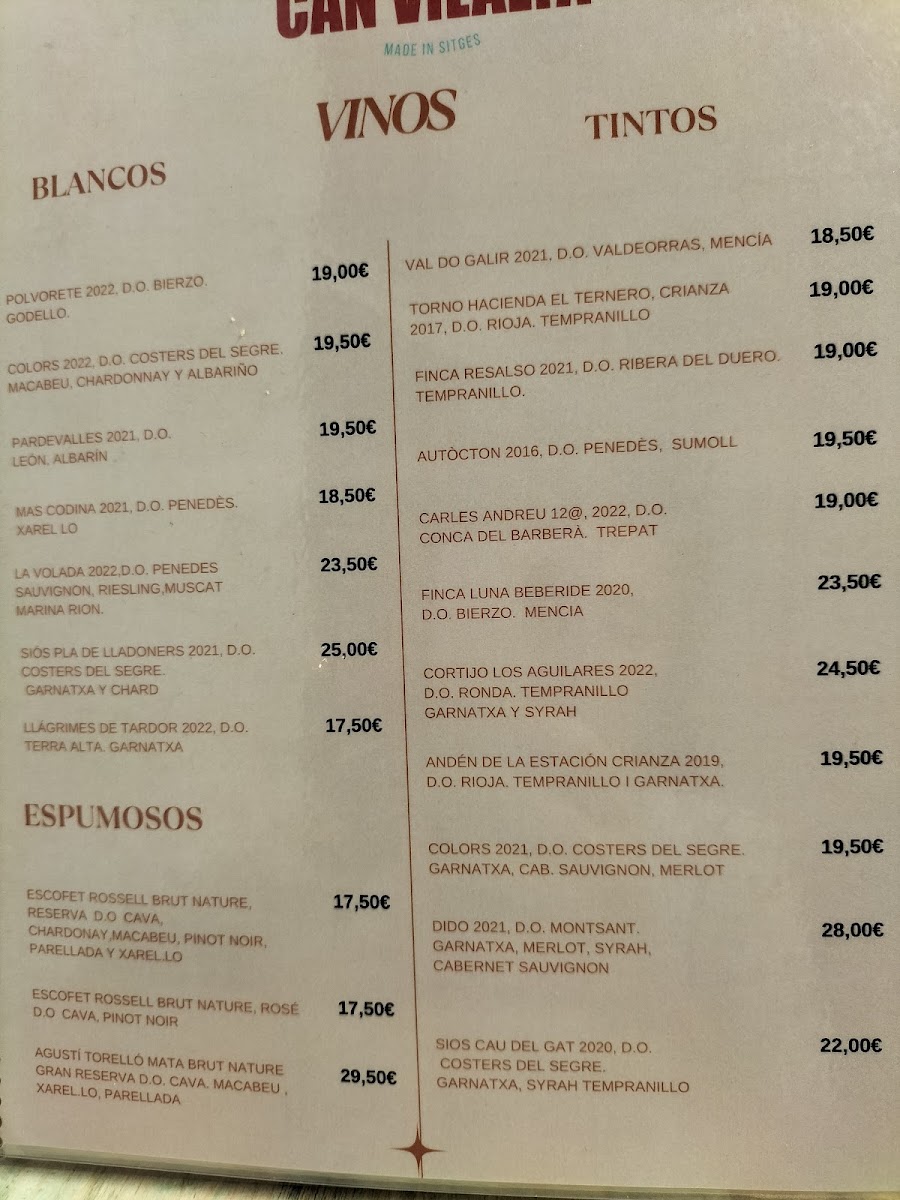 Wine enthusiasts can enjoy a selection of wines, including Polvorete D.O. Bierzo and Llágrimes De Tardor D.O. Terra Alta among the whites, and the reds such as Andén De La Estación D.O. Rioja and Finca Resalso D.O. Ribera Del Duero.