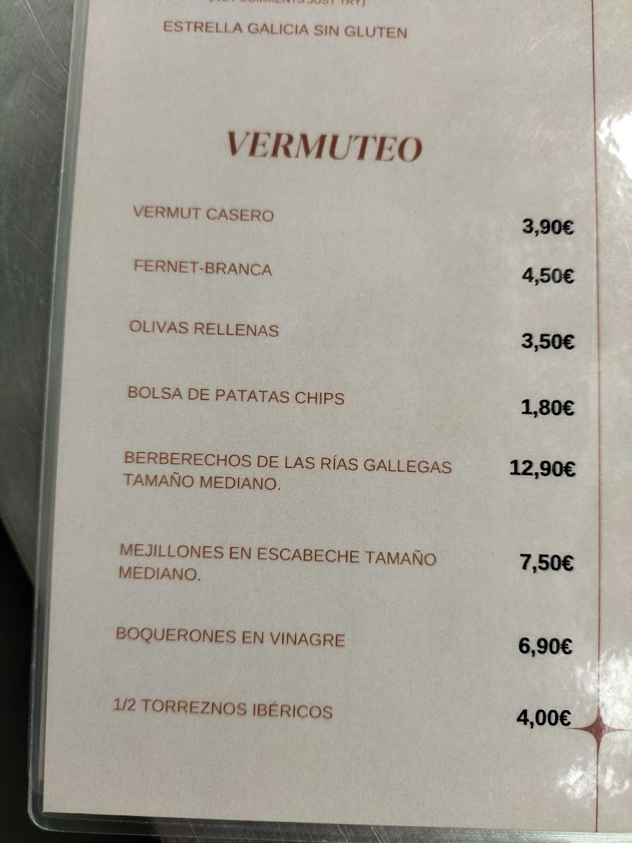 The "Vermuteo" section of the menu is an ideal option for those looking to enjoy tapas-style appetizers with a drink. The selection includes Olivas Rellenas (stuffed olives), Bolsa De Patatas Chips (crispy chips), and regional specialties like Mejillones En Escabeche (marinated mussels) and Berberechos De Las Rías Gallegas (Galician cockles), perfect for snacking while sipping on vermouth.